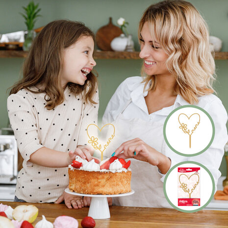 Dekora Cake Topper Gold Mama Heart 16X11cm. Mooie cake topper voor de liefste moeder. Verras je moeder met een mooie taart voor haar verjaardag of voor moederdag. De acryl taart topper is ongeveer 16cm hoog en 11cm breed. Verwijder het plastic beschermlaagje voordat je de taart topper gaat gebruiken.