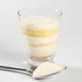 Een heerlijke bavarois maak je eenvoudig met deze naturel poeder mix. Naturel al heerlijk, maar ook naar ieder gewenste smaak te brengen door simpelweg variaties toe te voegen, zoals bijv. verse vruchten, jam, maar ook met bijv. vruchtensappen.