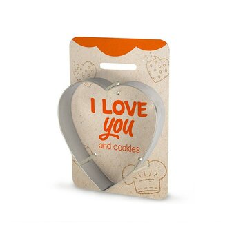 Leuke koekjes uitsteker in de vorm van een hart met de teks: I love you and cookies. Leuk om cadeau te geven samen met een zakje koekjesmix!