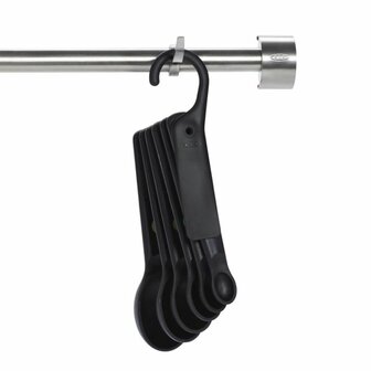 De maatlepels in deze 6-delige maatlepelset van OXO Good Grips klikken op elkaar voor compact opbergen. De set waaiert uit zodat je de maatlepel die je nodig hebt er makkelijk uit neemt, terwijl de rest compact op elkaar geklikt blijft. De lepels hebben een zachte comfortabele greep, duidelijk leesbare gekleurde markeringen en liggen vlak op het werkblad om overlopen te voorkomen. De lepels hebben een inhoud van 0,6 ml (1/8 tsp), 1,25 ml (1/4 tsp), 2,5 ml (1/2 tsp), 5 ml (1 tsp), 7,5 ml (1/2 T) en 15 ml (1T). Met de schraper kun je ingrediënten vlak afmeten en de haak kan gebruikt worden om de set op te hangen. De maatlepelset is vaatwasmachinebestendig.
