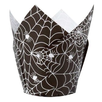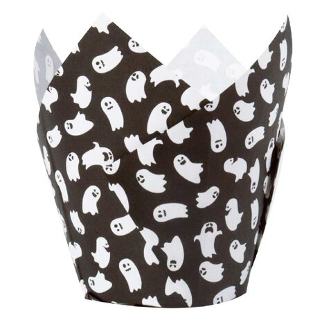 • Pakket van zwarte vormpjes met witte geesten & spinnenwebpatronen. Bevat 2 ontwerpen x 12 bakvormpjes van elk