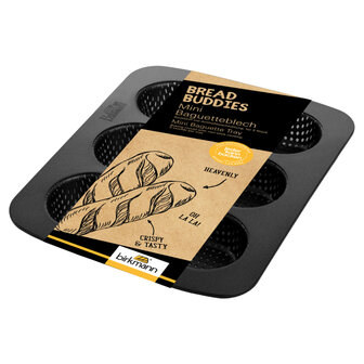 Met het mini-stokbroodbakje uit de serie Bread Buddies tover je in een handomdraai goudbruine en knapperige broodjes zoals uit de bakker. Op de bakplaat is ruimte voor maximaal 3 mini-baguettes - of het nu gaat om tarwe-, volkoren- of roggebaguettes. Natuurlijk kun je ook verschillende stokbroodvariaties tegelijk uitproberen, bijvoorbeeld zoete mueslistokbroodjes of een hartige variant belegd met ham- of kaasblokjes - er is dus voor ieder wat wils! Het deeg verspreidt zich niet tijdens het rijzen en de baguettes krijgen hun typische vorm. Het hoogwaardige en speciaal geperforeerde koolstofstaal zorgt voor een ideale warmteverdeling en de fijne perforatie zorgt ervoor dat overtollig vocht tijdens het bakken kan ontsnappen. Dit zorgt voor goudbruine en bijzonder knapperige baguettes! Dankzij de hoogwaardige merk-antiaanbaklaag is er geen bakpapier nodig, omdat ze vrijwel vanzelf uit de vorm loskomen.